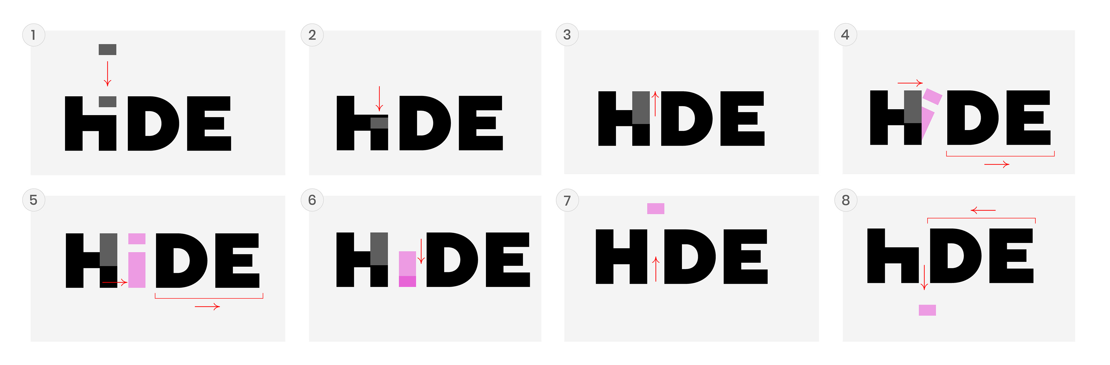 It emerges fully, claiming its place to symbolize confidence and recognition, then transforms into the dot, rising above the “H” and “D” using negative space to remain present, suggesting growth and adaptability. Finally, the dot falls and the cycle restarts, mirroring HIDE’s ongoing discovery of new talent.